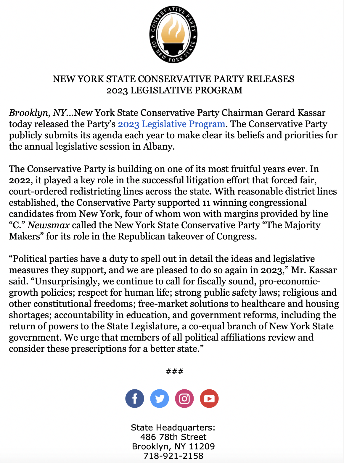 New York State Conservative Party Chairman, Gerard Kassar, has released the Party's 2023 Legislative Program.